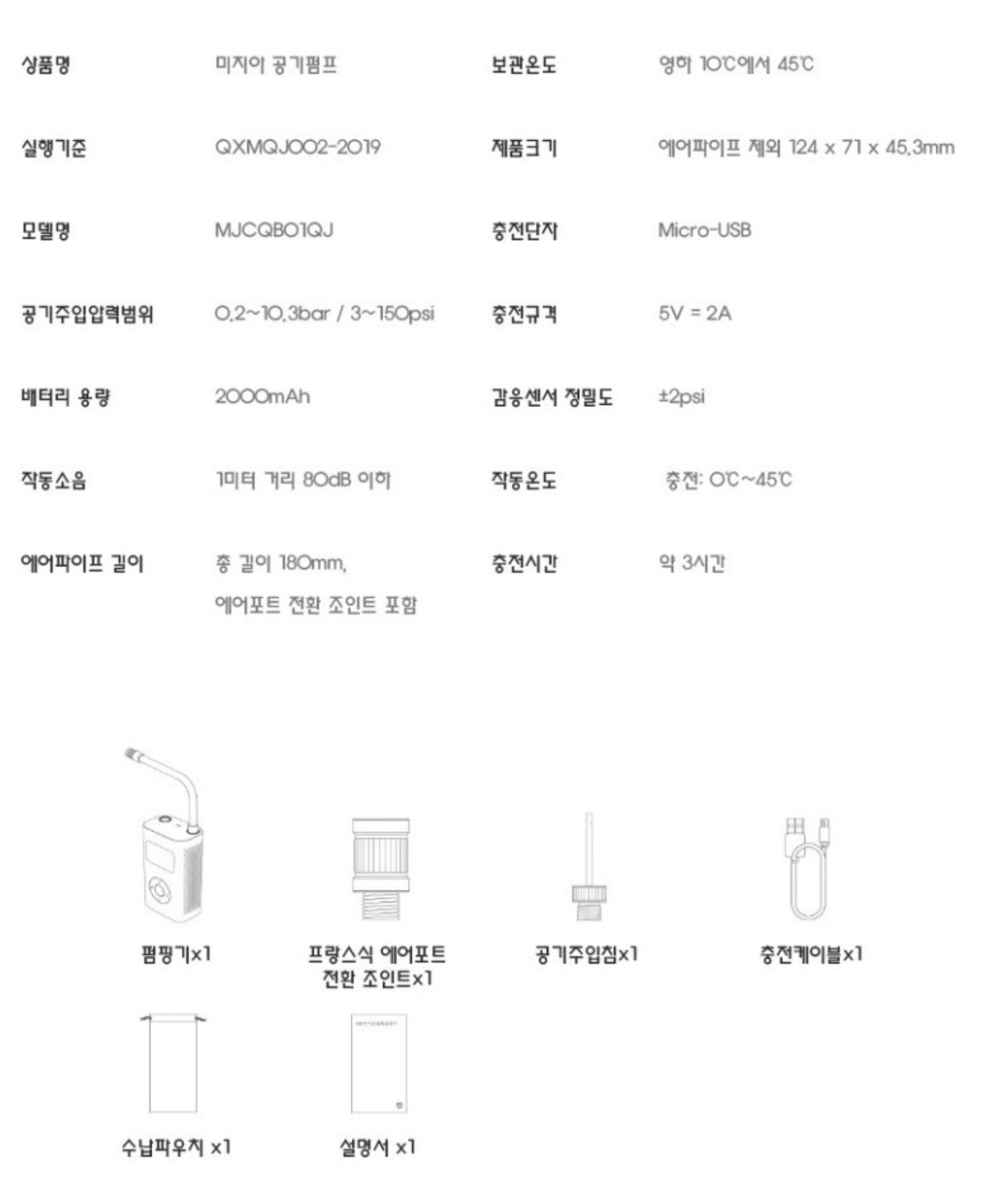 - 제품설명서 , 본체, 충전케이블(Micro USB) , 펌프 노즐 (프레스타,볼핀) ,휴대용케이스