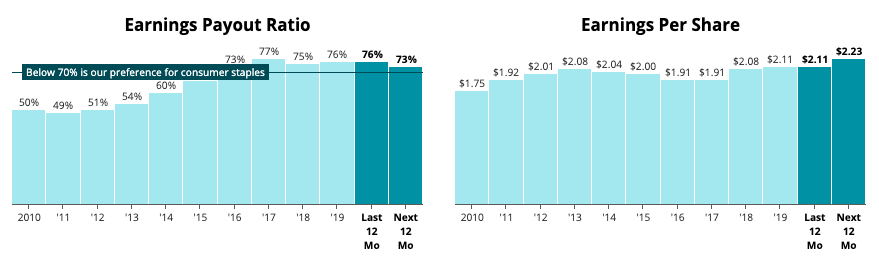 KO는 지난 1년간 수익의 76%를 배당금으로 지급했다. 이러한 지급 비율은 사업 상황이 악화될 경우 배당금을 지불할 수 있는 쿠션이 줄어들기 때문에 소비자 상품에 대한 높은 편으로 점차 높아지고 있다.